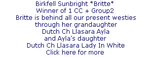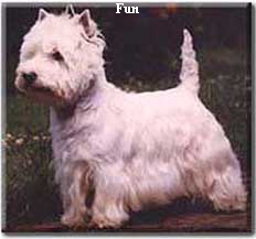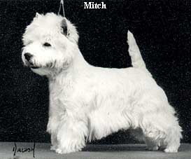 Our star then was Eng. Dutch. Int. CH. LASARA LOVE-ALL. Mitch to his friends.(click on photo for more info) Mitch achieved a lot during his showcareer. While still in England he won the group at Richmond Championship show, Best in Show breed club Championship shows twice, 6 CC's. When in Holland Mitch was Top westie, Top Terrier and no. 5 All breeds in 1988. Twice Best in Show at the WHWT club of Ned, Ch club show, once reserve Best in Show only beaten by kennel mate Dutch Ch. LLASARA AYLA . Mitch sired several Champions (Eng., Swedish, Dan, German, Am Ch) and his name is still behind top winners to day. As you can perhaps guess I am rather proud to have owned him. He was a delight to live with and to show.